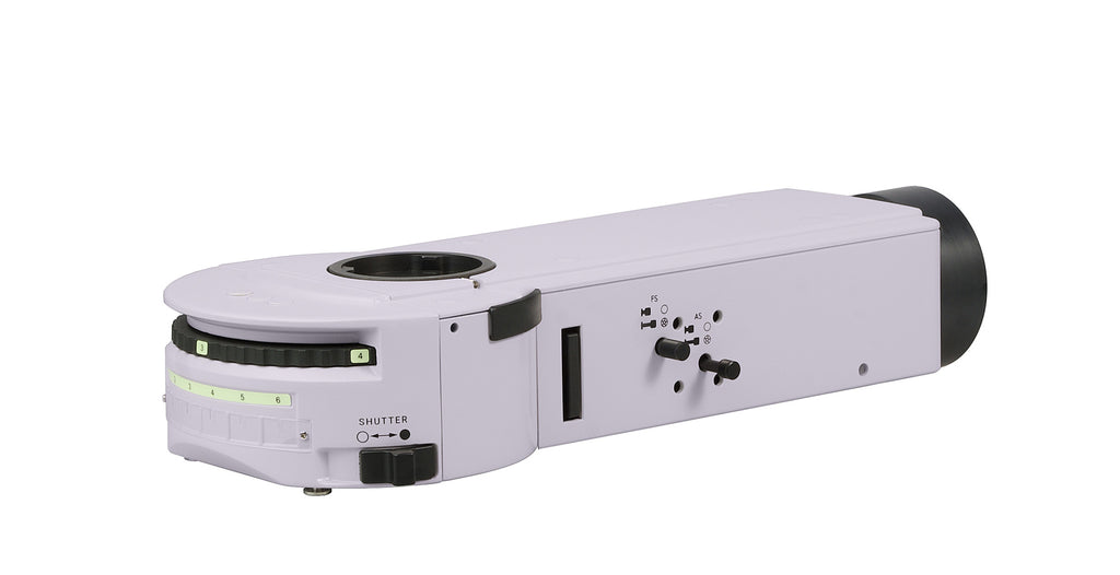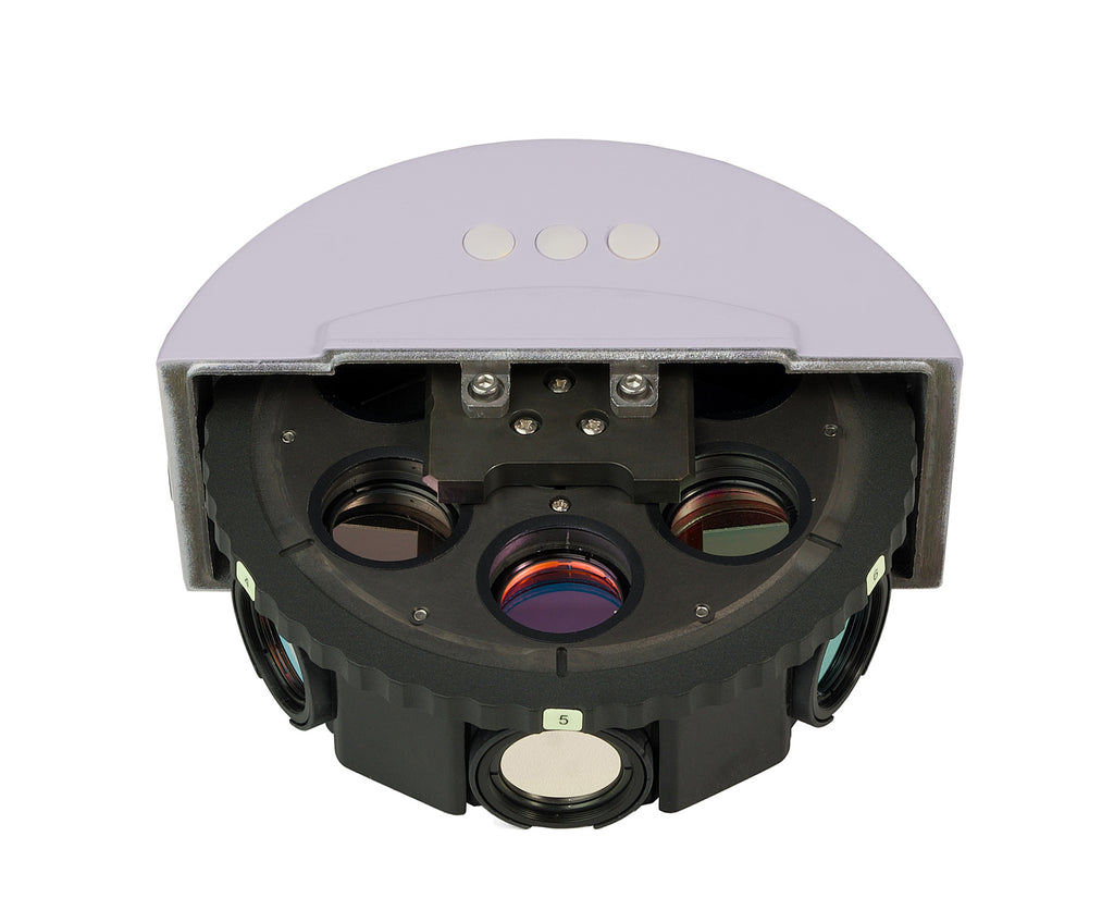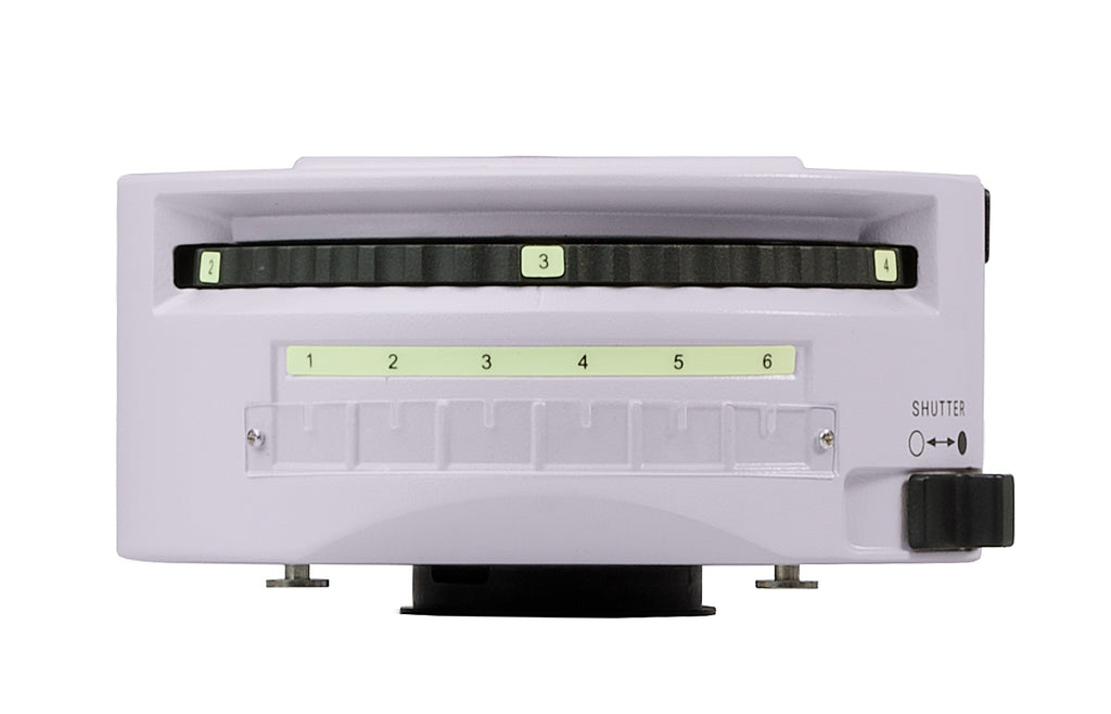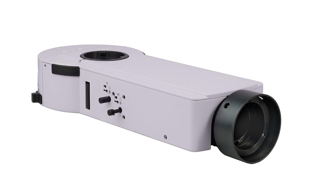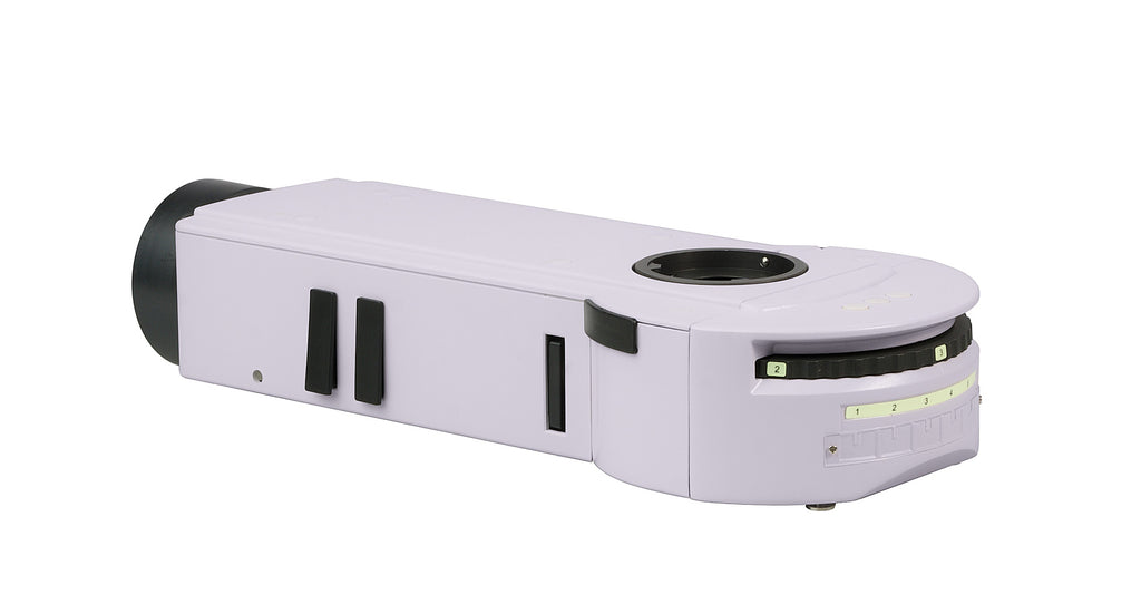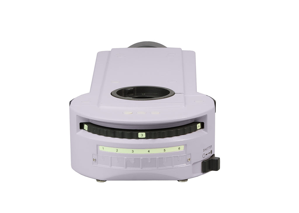 L’attacco viene montato sul cammino ottico tra la testata del microscopio e il supporto. All’interno dell’attacco, vi è una torretta girevole a 6 posizioni con filtri a fluorescenza. Cinque cubi per filtri fluorescenti sono installati contemporaneamente nella torretta (selezionabili dall’utente). Il filtro necessario viene introdotto sul cammino ottico ruotando l’anello. Una posizione della torretta corrisponde alla tecnica di campo chiaro. Le manopole laterali sono utilizzate per regolare l’apertura di campo e i diaframmi di apertura. Un set di cubi per filtri fluorescenti include filtri a fluorescenza di diverse lunghezze d’onda: blu a banda larga (B), verde (G), ultravioletto (UV), violetto (V), rosso a banda stretta (R) e filtri a banda stretta per fluorocromi DAPI, FITC e TRITC.