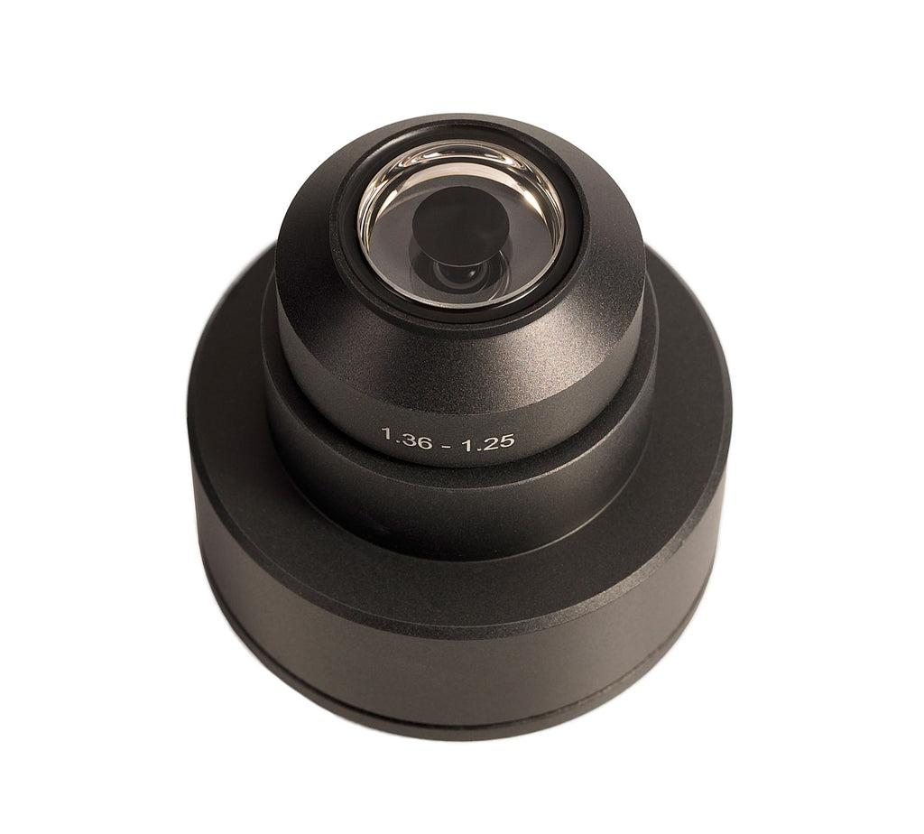 Questo condensatore per campo oscuro è installato nello stativo, al posto del condensatore di Abbe. Il condensatore è dotato di due viti di centraggio per il corretto allineamento dell’ostacolo opaco nel percorso ottico.