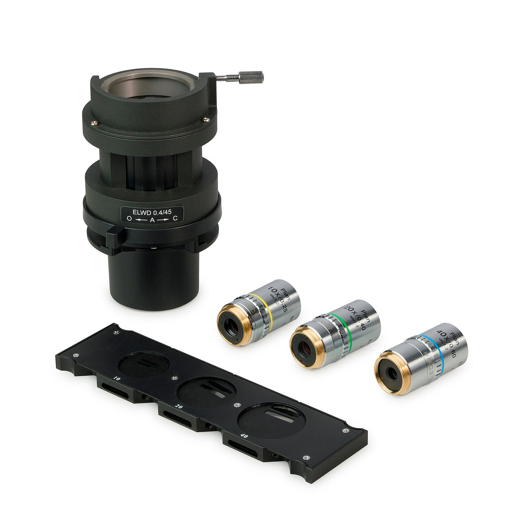 Il dispositivo MAGUS HCM360 è costituito da un set di obiettivi planacromatici, un condensatore e un vetrino che sono progettati per la microscopia con contrasto di modulazione Hoffman. Il modulatore dell’obiettivo è allineato con le aperture delle fessure mediante un telescopio di centraggio dal kit del microscopio.