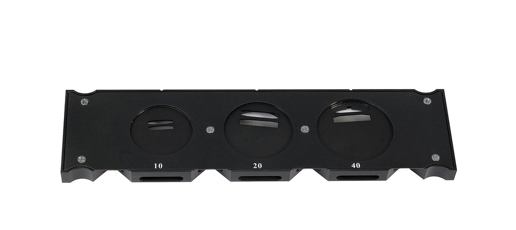 Il vetrino Hoffman viene inserito nell’alloggiamento del condensatore Hoffman. Il vetrino è una piastra con tre inserti rotondi per obiettivi 10x, 20x e 40x. La marcatura dell’inserto corrisponde all’obiettivo utilizzato. In ciascun inserto sono presenti due fessure: una è libera e l’altra è chiusa da un polarizzatore. Gli inserti nel vetrino sono ruotabili di 360° e centrabili.