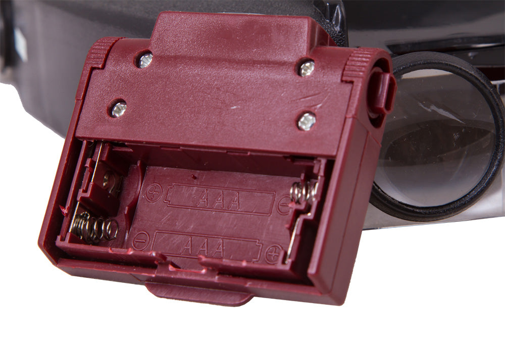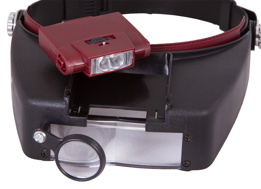 La lente d’ingrandimento frontale Levenhuk Zeno Vizor H2 si fissa sulla testa grazie a una fascia speciale di larghezza regolabile. La lente frontale è dotta di luci LED per illuminare l’area di lavoro. Si possono accendere e spegnere a seconda del bisogno, tramite un interruttore sul corpo del dispositivo.