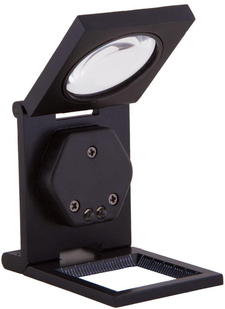 La lente è fatta in vetro ottico ed è fissata in sicurezza su una montatura. L’inclinazione regolabile dell’angolo consente di usare la lente comodamente con oggetti di differenti dimensioni o forme. Il diametro della lente è di 30 mm, che la rende comoda da usare anche con oggetti ampliati. L’ingrandimento di 6x consente di osservare anche i più piccoli dettagli. La montatura in metallo è stabile e affidabile – e lenti sono saldamente fissate su di essa. Nella montatura sono installati due LED – potrete lavorare con questa lente d’ingrandimento anche al buoi. I LED funzionano con 2 batterie CR927 e hanno intensità regolabile.