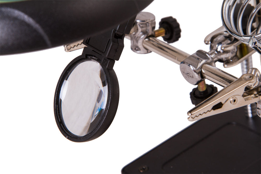 Il terzo supporto per la mano vi aiuterà a stampare tavole di modelli 3D – fissa fermamente l’oggetto e facilita il lavoro da vicino per lunghi periodi di tempo. La lente di ingrandimento è equipaggiata anche con uno speciale supporto per un ferro da saldatura (rimovibile, se necessario).