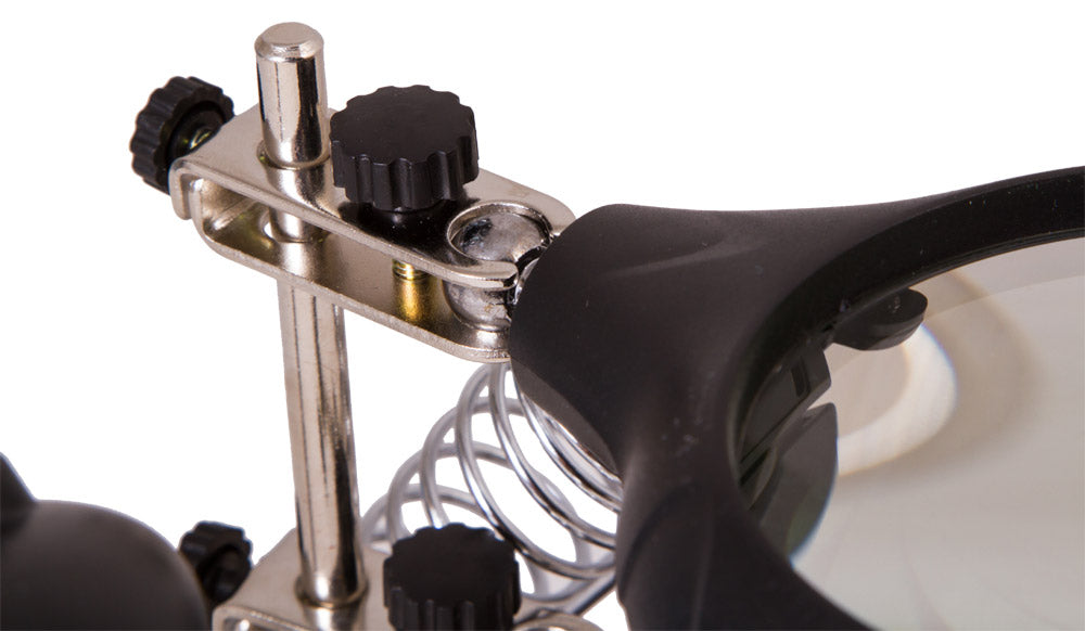 Le lenti sono posizionate su una griglia verticale e potranno essere spostate lungo la griglia per portale più vicine o distanti dall’oggetto osservato. L’illuminazione integrata consiste di cinque LED che diffonde una luce uniforme e costante sull’area di lavoro. Funziona con un adattatore A/C (incluso) o tre batterie AA (non incluse).
