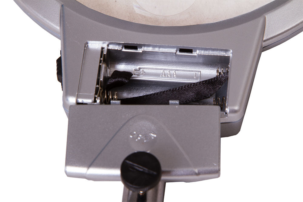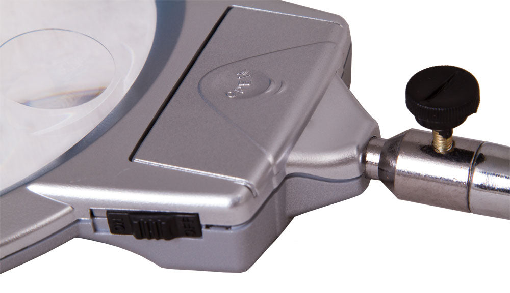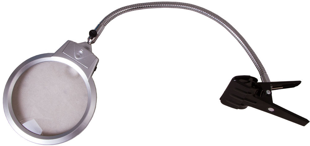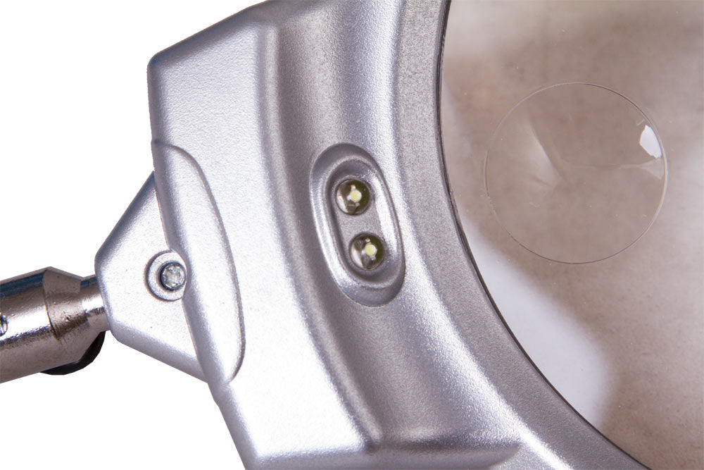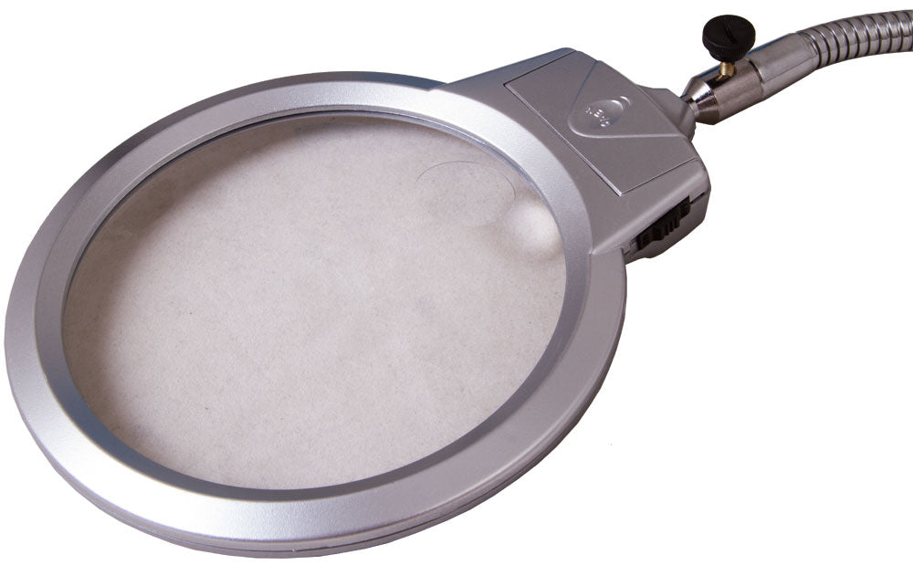 Un collo flessibile consente il posizionamento preciso della lente proprio sopra l’oggetto. La lente è bifocale e fornisce ingrandimenti di 2x e 5x, rispettivamente con i diametri maggiore e minore. Due diodi luminosi integrati alla base della lente forniscono una luce uniforme e chiara. Sarete in gradi di usare la lente anche in scarse condizioni di luce.