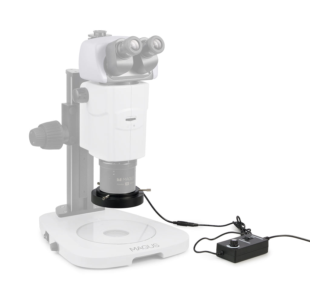 Una luce ad anello LED con diffusore opaco è progettata per fornire illuminazione brillante, uniforme e priva di ombre di un oggetto con luce riflessa. Viene installata direttamente sull’obiettivo dello stereomicroscopio CMO in modo che il flusso luminoso sia diretto coassialmente. Questo è particolarmente importante durante le osservazioni di campioni piatti, lucidi o a basso contrasto.