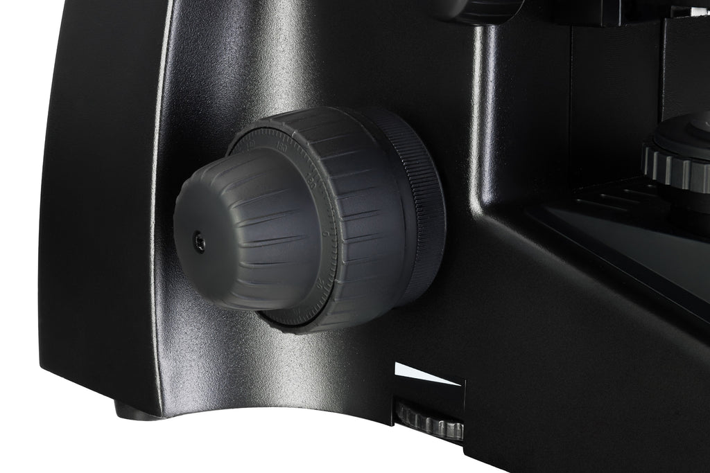 L’assenza di una cremagliera di posizionamento rende il dispositivo più ergonomico. La manopola orizzontale del tavolino è posizionata in basso per la comodità dell’utilizzatore. Il porta campione è progettato per ospitare due campioni. Le manopole di messa a fuoco consentono la regolazione grossolana e fine della messa a fuoco. I movimenti del tavolino avvengono in modo fluido e senza scatti.