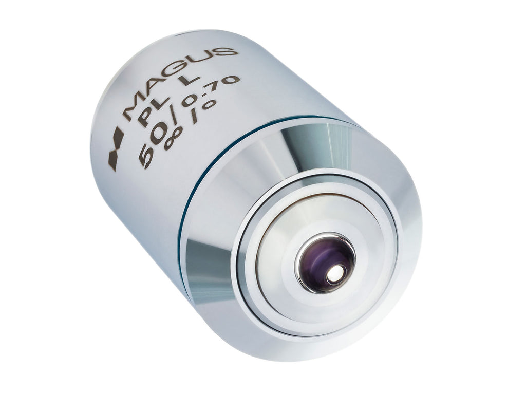 L’ingrandimento utile che produce il microscopio in combinazione con questo obiettivo è nell’intervallo di 350–700x. Per l’immagine più chiara, si consiglia di combinare un obiettivo di 50x/0,70 con oculari con ingrandimento da 7x a 15x.