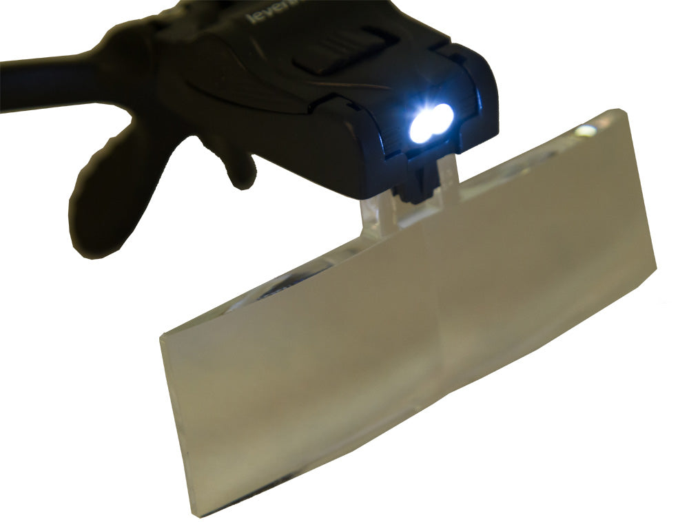 La lente di ingrandimento è dotata di illuminazione a LED incorporata, alimentata a batterie (incluse nel kit). La luce fornita è sufficiente a illuminare accuratamente l’oggetto osservato o l’intera area di lavoro.