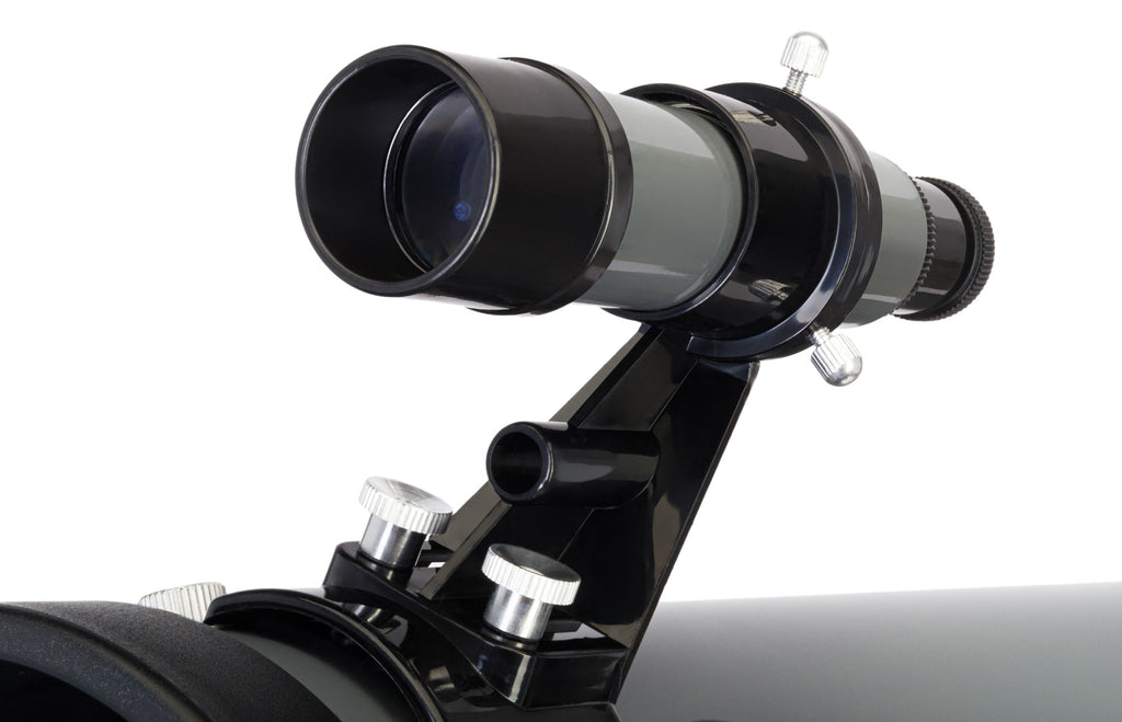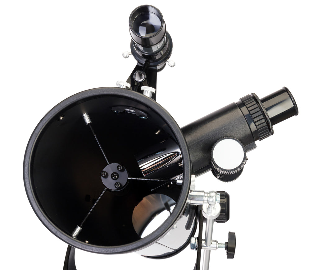 Con la montatura azimutale a forcella, usare il telescopio è facile come adoperare un cannocchiale terrestre. Per centrare il telescopio sull’oggetto scelto, basta ruotare il tubo ottico nella direzione desiderata: su, giù, destra o sinistra. La montatura è dotata di una vite micrometrica sull’asse verticale, che consente di orientare il telescopio con accuratezza e fluidità. Il treppiede in alluminio è regolabile in altezza e dotato di vassoio per accessori.