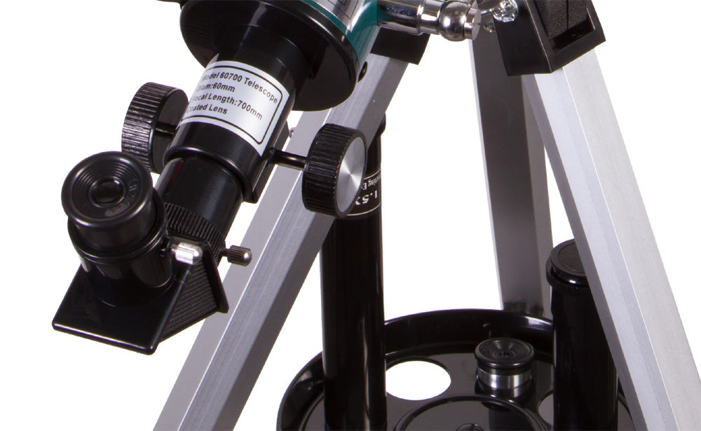 Il telescopio viene venduto con un potente cercatore ottico 5x. La montatura altazimutale, semplice da usare, non creerà problemi con il puntamento del telescopio verso un qualsiasi oggetto celeste. Il tubo ottico è tenuto saldamente in posizione da una stabile montatura in alluminio che non produce alcuna fastidiosa vibrazione durante l’osservazione. Il treppiede è dotato di un pratico vassoio porta accessori, dove posizionare tutti gli strumenti necessari. Il kit comprende anche una lente di Barlow 3x, che renderà l’ingrandimento del telescopio tre volte più potente.