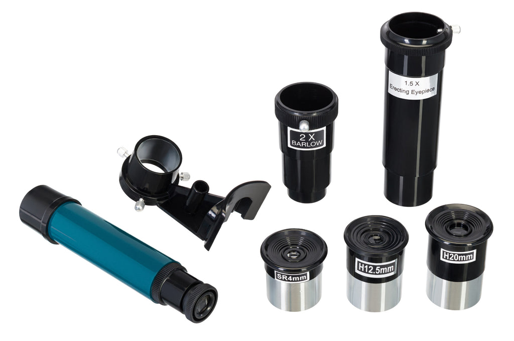 Tutti gli accessori necessari sono inclusi nella confezione, quindi non è necessario acquistarli separatamente. Inoltre, il kit comprende una robusta custodia in plastica con maniglia. Essa può contenere il telescopio e tutto il suo set di accessori, che sono quindi facili da trasportare e riporre.