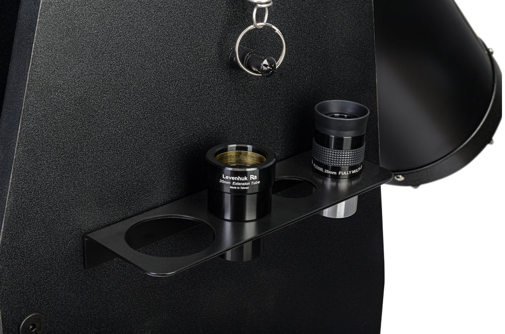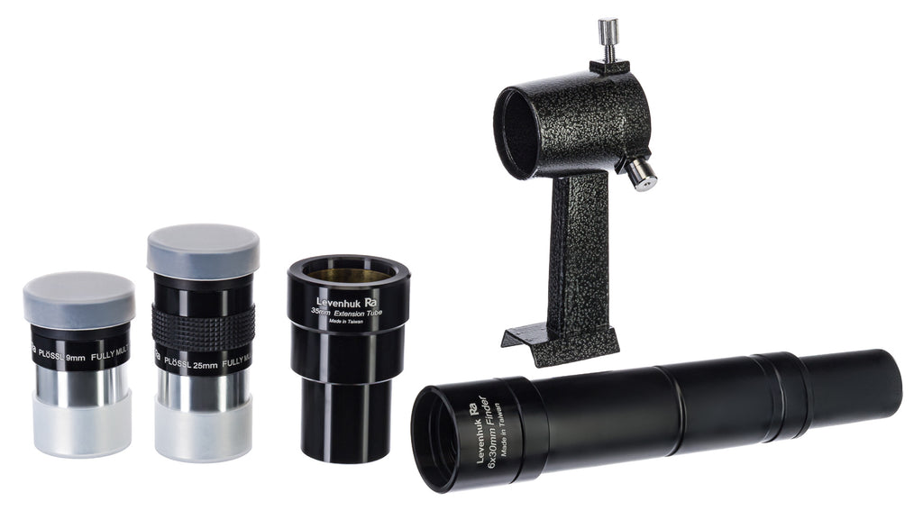 Il kit comprende due oculari simmetrici: 9 mm e 25 mm. Questi oculari offrono un’ottima visuale e consentono di iniziare immediatamente a esplorare il cielo stellato. La ricerca di oggetti astronomici è affidata a un cercatore ottico 6x30 mm.