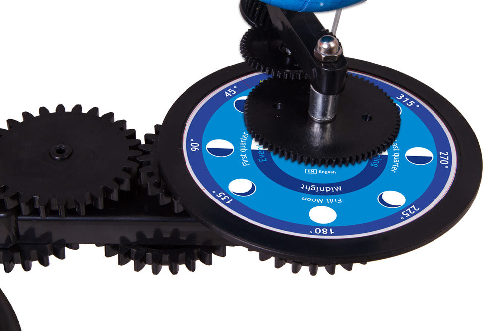 Prima di lavorare con il tellurio, posizionarlo su una superficie piana stabile. Il tellurio è fissato su un supporto con una vite speciale. Girare il globo terrestre intorno al Sole in senso antiorario ruotando una piccola manovella. Il meccanismo inizierà a ruotare e la Luna inizierà ad orbitare velocemente intorno alla Terra. Mentre la Terra orbita attorno al Sole una volta, la Luna orbita attorno alla Terra 12 volte, corrispondenti ai 12 mesi dell’anno.