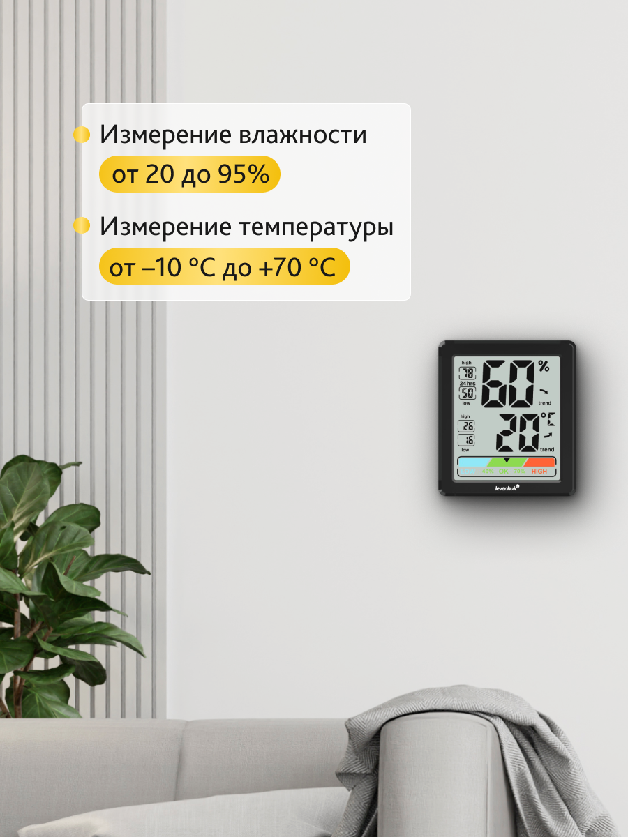 Il termoigrometro Levenhuk Wezzer BASE L20 è un dispositivo compatto da parete. Rileva i livelli di umidità e temperatura in una stanza, registrando i valori massimi e minimi. Inoltre, mostra gli andamenti, indicando le variazioni nei parametri meteo. Fornisce un’eccellente opportunità per monitorare i cambiamenti del microclima di una camera da letto, della stanza di un bebè, di un ufficio o una casa di campagna.