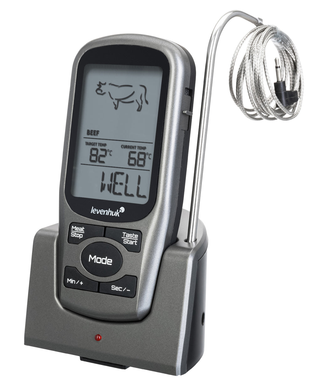 Levenhuk F30 è un termometro a sonda wireless progettato specificatamente per la massima precisione nella misura della temperatura di cottura delle carni. La sua funzionalità più interessante è l’opzione di scelta del tipo di carne e del grado di cottura desiderato. Ciò rende possibile ottenere un piatto cucinato alla perfezione con il minimo sforzo. Questo strumento è anche dotato di timer e di una funzione di notifica tramite cicalino per quando si raggiunge la temperatura limite.