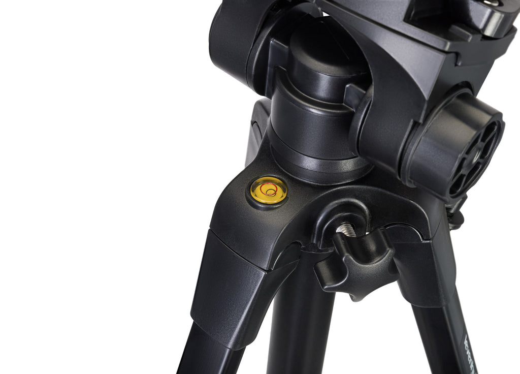 L’altezza di ognuna delle gambe del treppiede può essere regolata singolarmente. Grazie al sistema di blocco a leva, questa operazione risulta rapida e semplice. È inoltre possibile alzare o abbassare la colonna centrale. Per ottenere il massimo della stabilità, è possibile appendere un contrappeso a un gancio sulla colonna centrale. Questo treppiede è adatto a supportare un peso massimo di 5 kg. La livella a bolla consente di posizionare la fotocamera installata in modo che sia parallela al suolo.