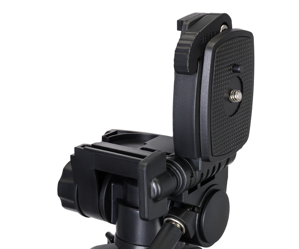La testa ruota di 360° sul piano orizzontale attorno al proprio asse e si inclina in avanti e indietro, mentre la piastra fissa può essere inclinata di lato fino a 90°, consentendo di trovare l’angolo perfetto in cui posizionare la propria apparecchiatura. In aggiunta, la colonna centrale del treppiede può anche essere usata come monopiede. La piastra a sgancio rapido rende più semplice il posizionamento e la sostituzione delle attrezzature sul treppiede.