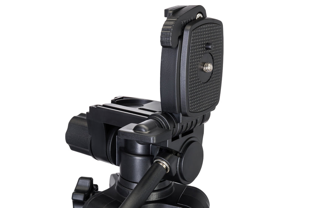 La testa è dotata di una piattaforma può essere ribaltata in verticale fino a 90°. Inoltre, la testa è girevole a 360° e può essere alzata o abbassata. Tutti gli assi del treppiede sono dotati di manopole di blocco. La filettatura standard da 1/4' consente l’installazione di quasi qualsiasi equipaggiamento moderno. Si consideri che per l’installazione di alcuni dispositivi potrebbe essere necessario un adattatore (non incluso).