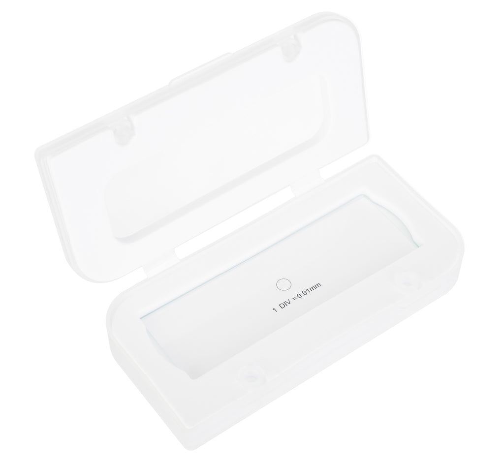 Il vetrino presenta una scala micrometrica orizzontale con 100 divisioni. La divisione è pari a 0,01 mm e la lunghezza della scala è 1 mm.