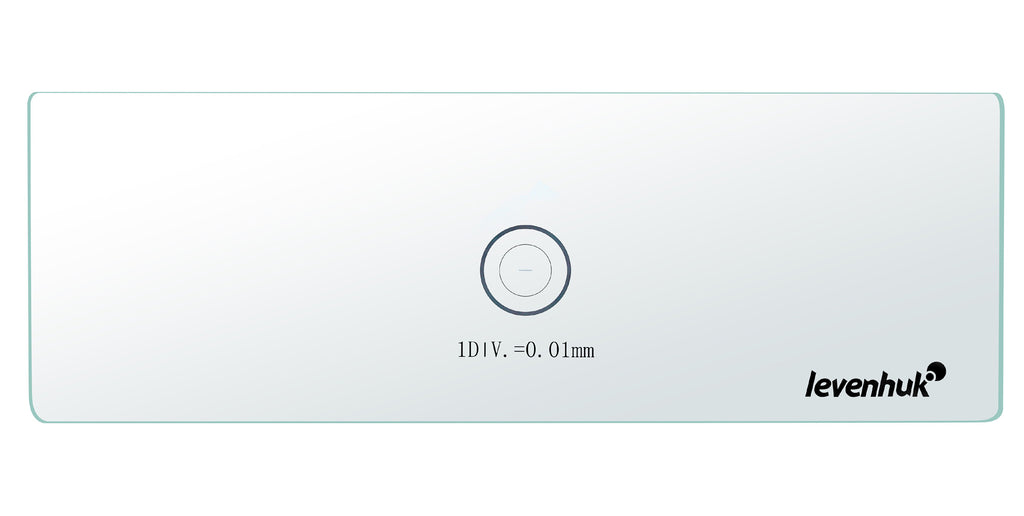 Il vetrino di calibrazione Levenhuk MED è un accessorio del microscopio utilizzato per la calibrazione dei programmi di analisi dell’immagine. Si tratta di un pezzo di vetro trasparente con una scala micrometrica sulla superficie. La scala si trova in un cerchio ed è chiaramente visibile al microscopio. Il valore minimo è 0,01 mm. Il vetrino di calibrazione consente di regolare rapidamente il programma in modo che prenda le misure nell’unità preferita.
