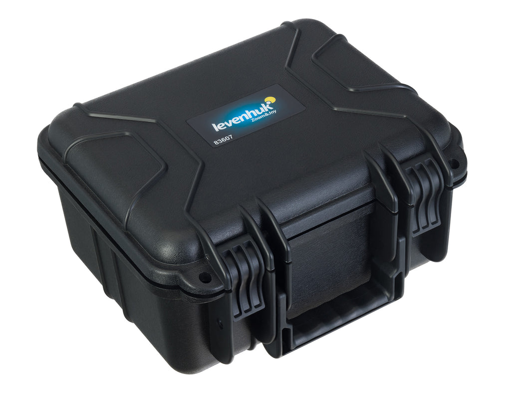 Il telaio è realizzato in plastica ABS migliorata ed è altamente durevole e resistente ai danni. Il grado di impermeabilità IP67 permette di utilizzare il monocolo in condizioni atmosferiche nuvolose o di pioggia. Per facilità d’uso, il kit comprende un supporto per casco.