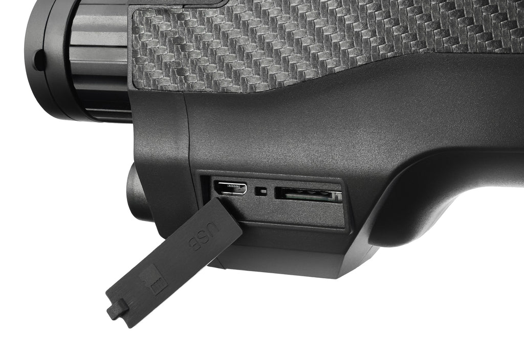 Il corpo leggero del monocolo è realizzato in plastica ABS, un materiale noto per essere resistente alle sollecitazioni meccaniche. Il dispositivo compatto e di dimensioni ridotte può essere trasportato facilmente e impugnato comodamente con entrambe mani. Il monocolo è alimentato da una batteria ricaricabile sostituibile con un’autonomia di 5 ore (con illuminazione IR spenta). La funzione di spegnimento automatico del display e del dispositivo consente di far risparmiare notevolmente la batteria.