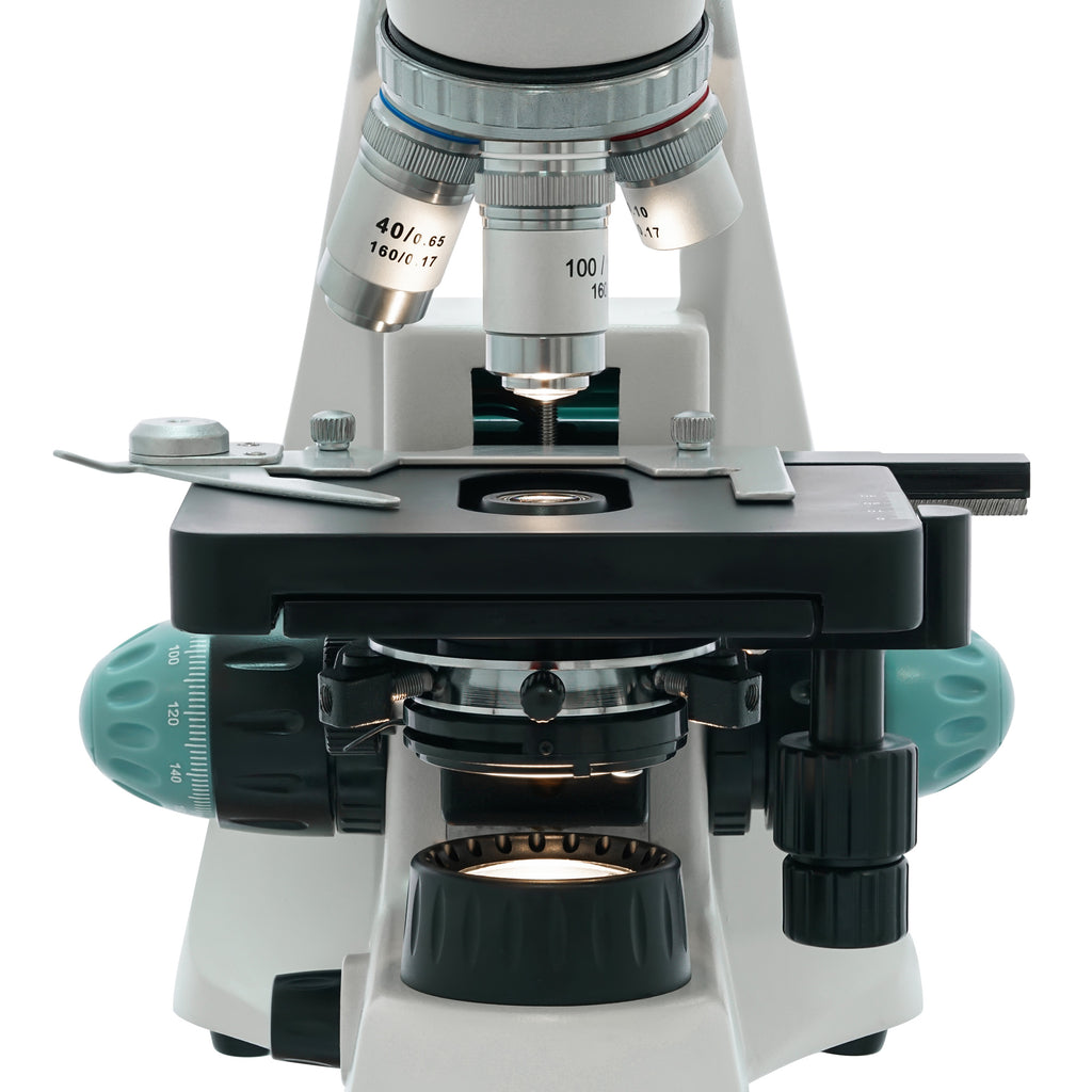 Il microscopio è equipaggiato con un tavolino dotato di traslatore meccanico, utile per il posizionamento accurato del campione sotto all’obiettivo. Sotto al tavolino, è presente un condensatore di Abbe ad altezza regolabile e con diaframma a iride. È possibile installare un filtro ottico usando uno speciale supporto. La potente luce alogena è equipaggiata con un collettore e dotata di regolazione della luminosità. La luce è alimentata dalla rete elettrica AC.