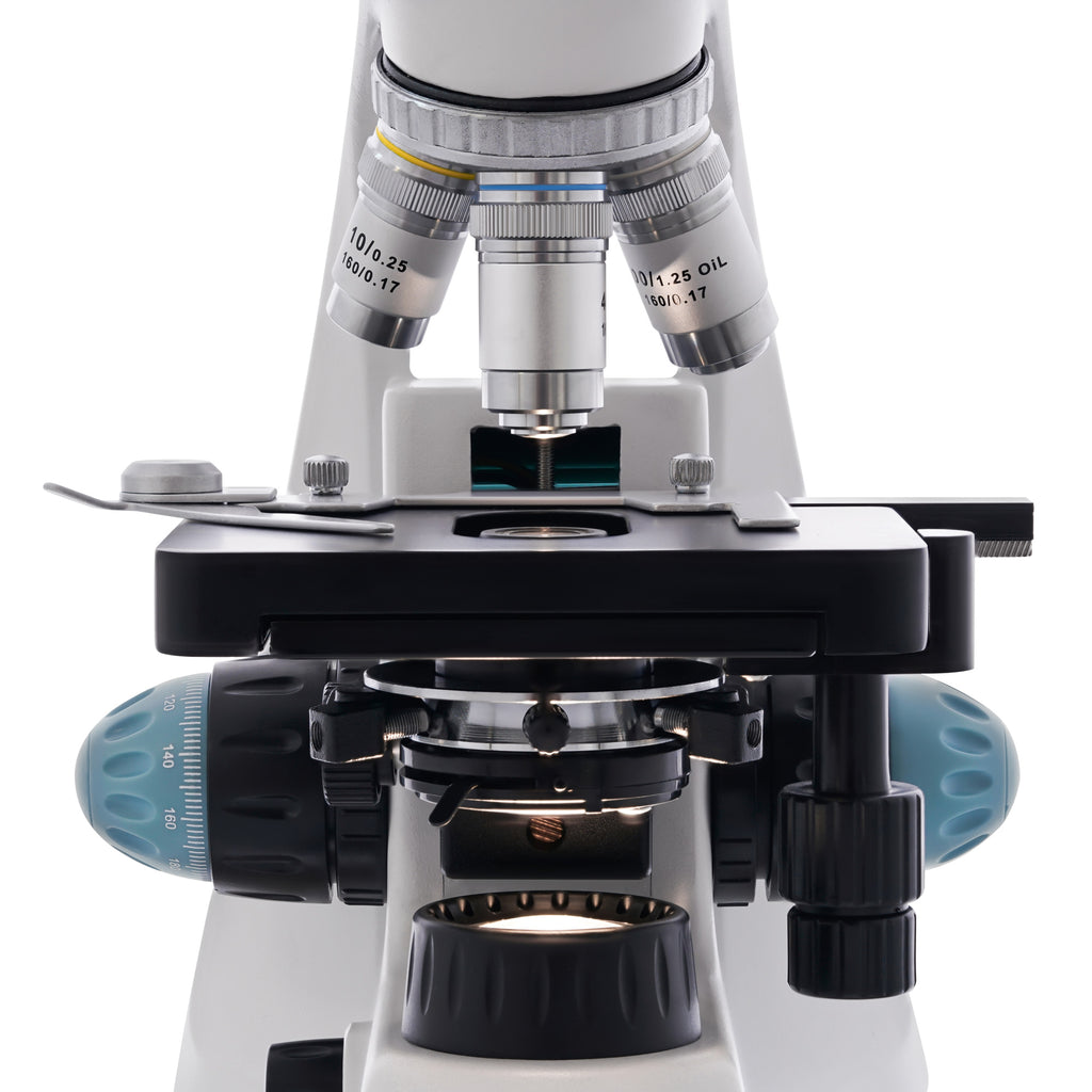 La testata trinoculare si compone di un visore e di un tubo verticale per l’installazione di una fotocamera digitale (non inclusa). È possibile ruotare la testata di 360°. Il kit comprende un oculare a campo largo e quattro obiettivi acromatici con ingrandimenti differenti. La nitidezza delle ottiche è regolabile tramite le manopole di messa a fuoco fine e grossolana posizionate sulla base del microscopio. Questo microscopio è progettato per osservazioni in campo chiaro. L’obiettivo da 100x può essere utilizzato per osservazioni mediante immersione in olio. Per la protezione della lente frontale, gli obiettivi da 40x e da 100x sono equipaggiati con un meccanismo a molla.