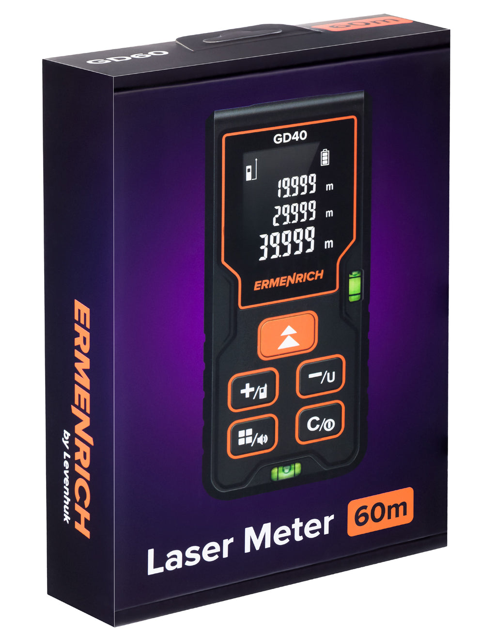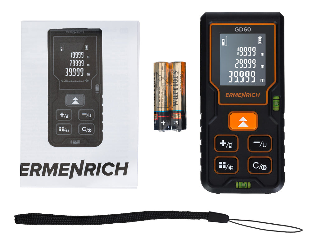 Il misuratore laser Ermenrich Reel PLUS GD60 è uno strumento universale di misura per i cantieri edili, le riparazioni, le installazioni e i lavori su commissione. Questo misuratore laser è adatto alla misura delle distanze e delle dimensioni lineari degli oggetti in un range tra gli 0,05 e i 60 metri, oltre alla misura delle aree e dei volumi delle stanze. È inoltre dotato di una funzione di calcolo chiamata “teorema di Pitagora” che consente di calcolare la distanza tra due punti basandosi su due misure intermedie, utile quando non è possibile posizionare lo strumento nei punti di interesse.