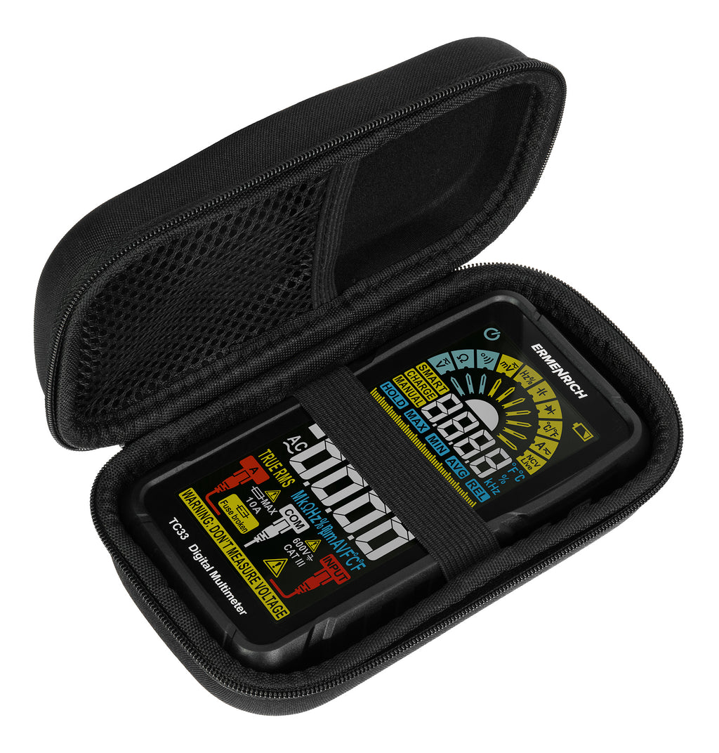 Il multimetro digitale Ermenrich Zing TC33 è un dispositivo di misurazione vero valore RMS che non prenderà molto spazio nella borsa dell’elettricista e consentirà di effettuare perfettamente attività di diagnostica e manutenzione di reti e dispositivi elettrici. Grazie all’ampia gamma di funzioni, il multimetro è un ottimo strumento per operazioni professionali. Può essere utilizzato anche dai non professionisti, poiché è dotato di funzioni intelligenti che lo rendono facile da utilizzare.