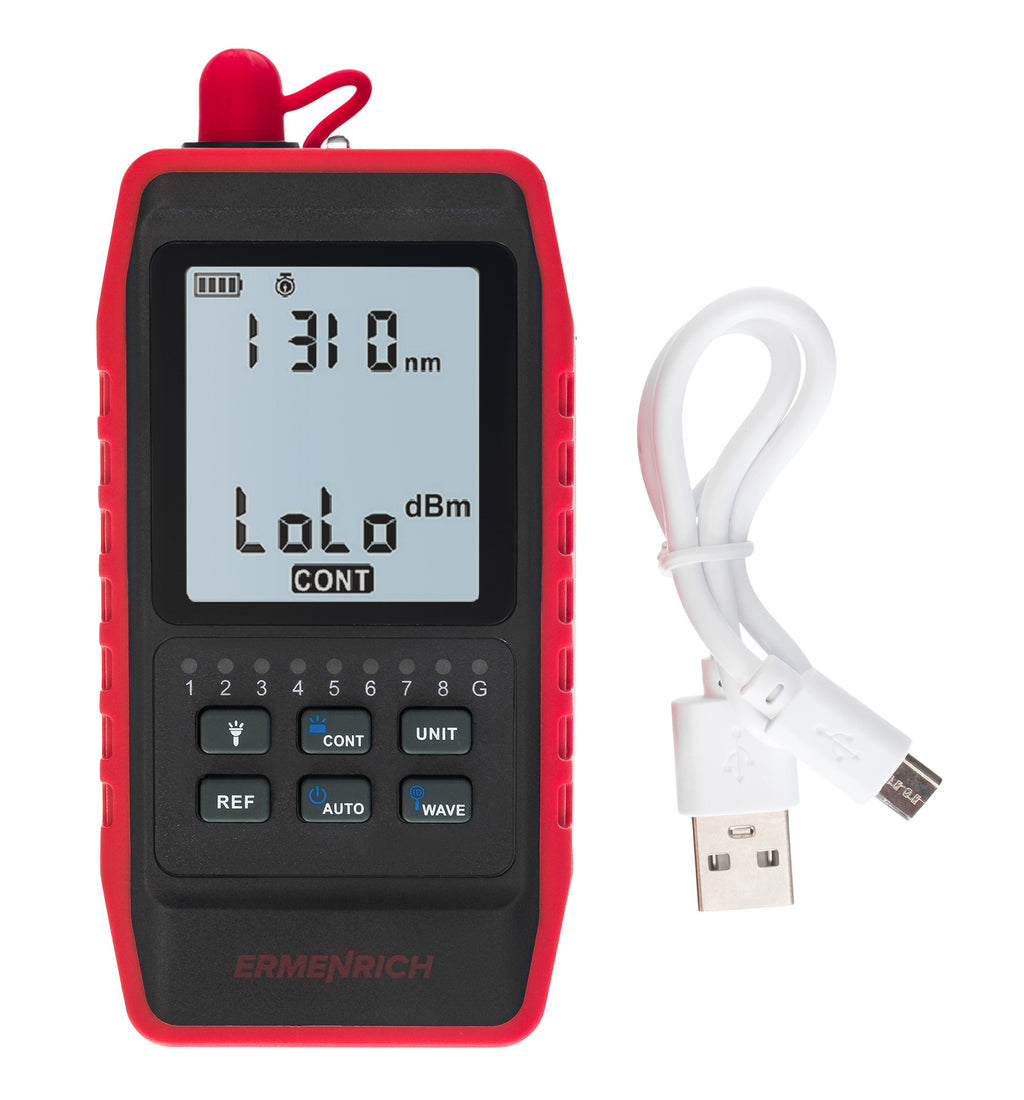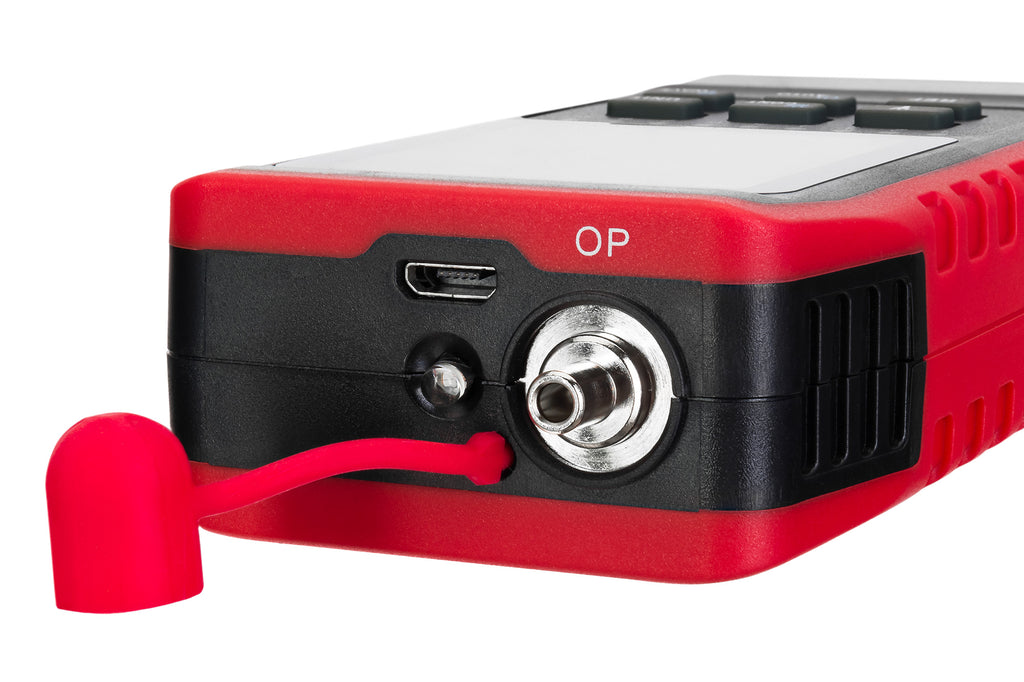 Sono disponibili sei lunghezze d’onda di test. Supporta fibre monomodali (SMF) o multimodali (MMF) e usa connettori per fibra ottica FC/SC/ST e un connettore di rete RJ45. Questo multimetro ha uno schermo integrato retroilluminato, al di sotto del quale sono presenti degli indicatori LED e i pulsanti di controllo. Lo strumento è alimentato da una batteria ricaricabile tramite cavo Micro-USB. Per un maggiore risparmio energetico, il multimetro è dotato di funzione di spegnimento automatico, che interviene dopo 30 minuti di inattività.