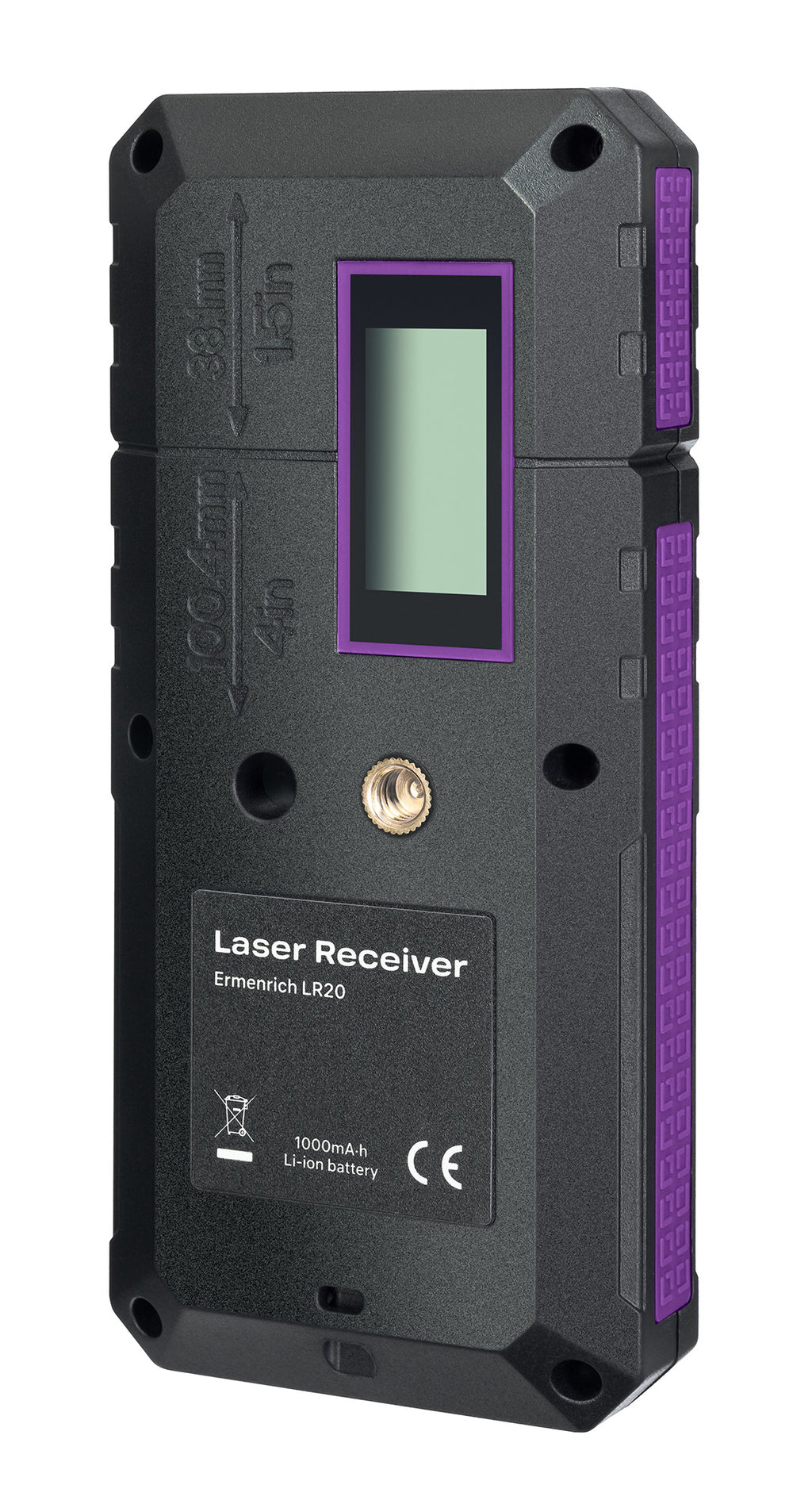 Ermenrich LR20 è un ricevitore laser da utilizzare con livelle laser. Riconosce raggi laser verdi e rossi a una distanza fino a 50 metri. Il dispositivo ha due impostazioni di precisione di livellamento: alta precisione con una precisione di 2 mm e bassa precisione con una precisione di 3 mm. Quando il raggio laser viene catturato, gli indicatori si illuminano e il cicalino suona. Il volume è regolabile e il cicalino può essere disattivato completamente, se necessario.