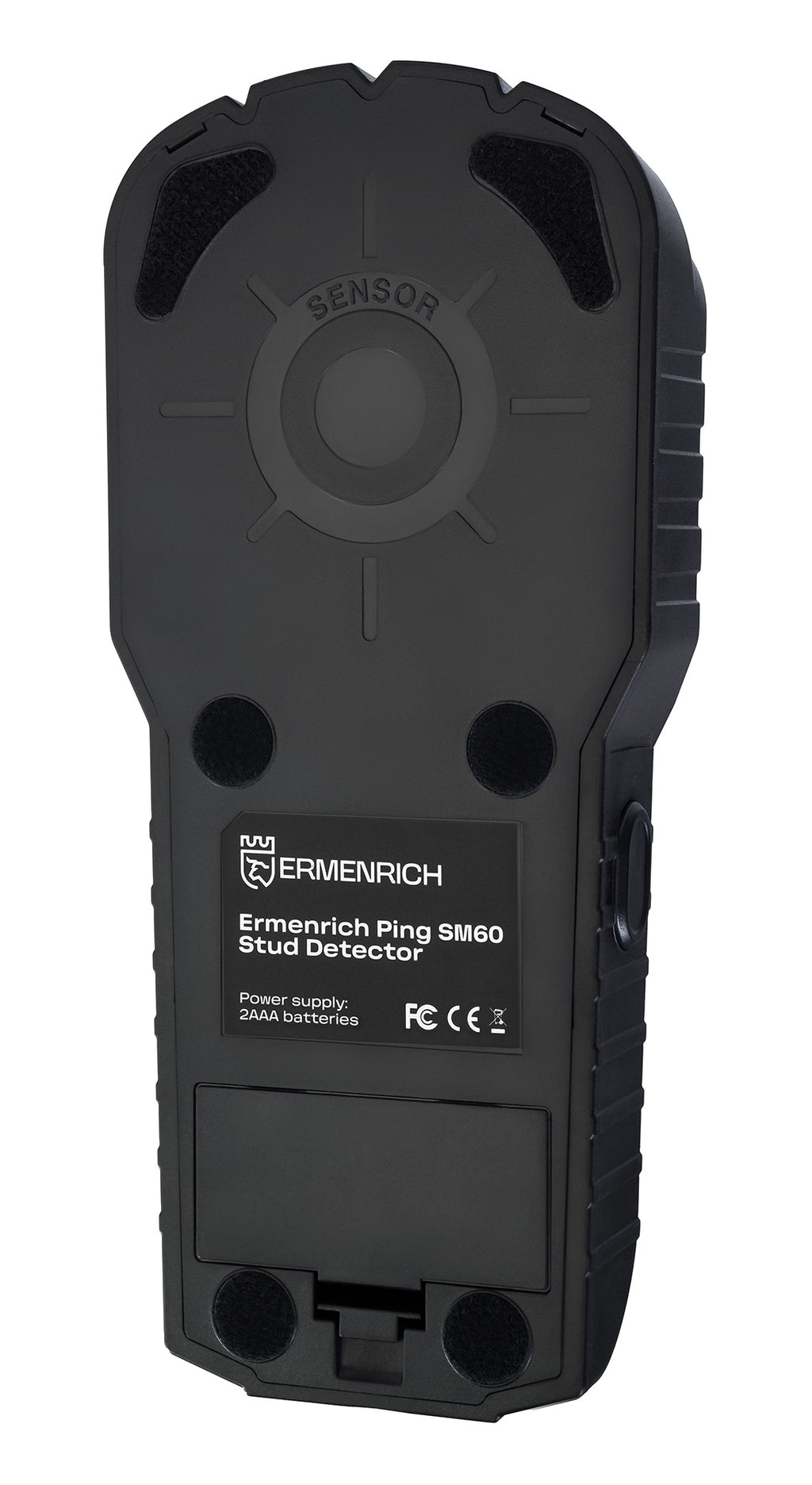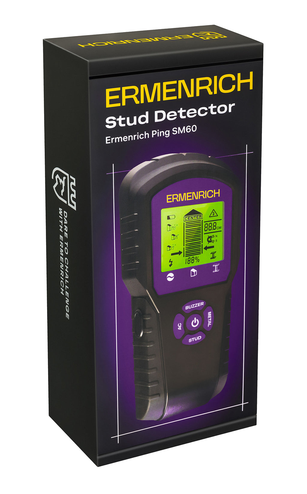 Il rilevatore di montanti Ermenrich Ping SM60 ha la possibilità di emettere avvisi sonori ed è equipaggiato con uno schermo LCD retroilluminato. La calibrazione è automatica. Il corpo, coi suoi pratici pulsanti di controllo, è realizzato in policarbonato e plastica ABS a elevata resistenza, materiali noti per la loro solidità contro gli urti. Questo rilevatore necessita di due batterie AAA. È dotato di funzione di spegnimento automatico che consente di risparmiare energia ed estendere la durata di un singolo set di batterie.