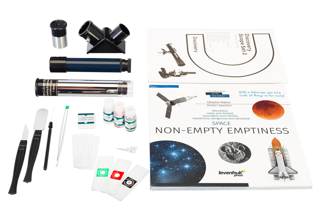 Il set Levenhuk Discovery Scope 2 comprende due strumenti ottici: un microscopio e un telescopio. Il microscopio sarà di grande aiuto nel padroneggiare le basi della microbiologia. Il telescopio si rivelerà fondamentale per imparare le basi dell’astronomia. Oltre agli strumenti ottici, il kit comprende vari pratici accessori utili per esplorare il mondo ed effettuare esperimenti scientifici. Il kit è completato dal libro educativo “Spazio. Vuoto non-vuoto”.