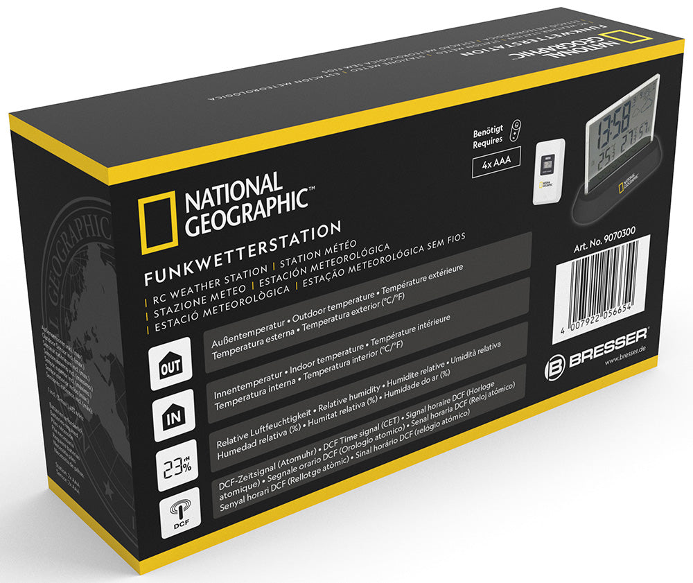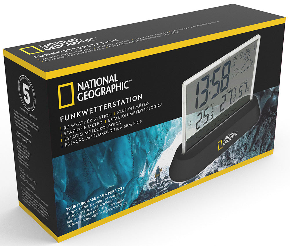 La stazione meteo radiocontrollata Translucidus di National Geographic è dotata di orologio a grandi cifre e di un supporto da tavolo snello ed elegante. I pulsanti di controllo sono stati collocati sul retro per sottolineare il bellissimo design. Comunque, grazie al display trasparente, sono chiaramente leggibili. Oltre al grande orologio radiocontrollato, il display indica anche la temperatura interna e quella esterna una accanto all’altra. Un vero e proprio gioiellino. La stazione meteo può essere utilizzata anche come sveglia ed è dotata di funzione snooze.