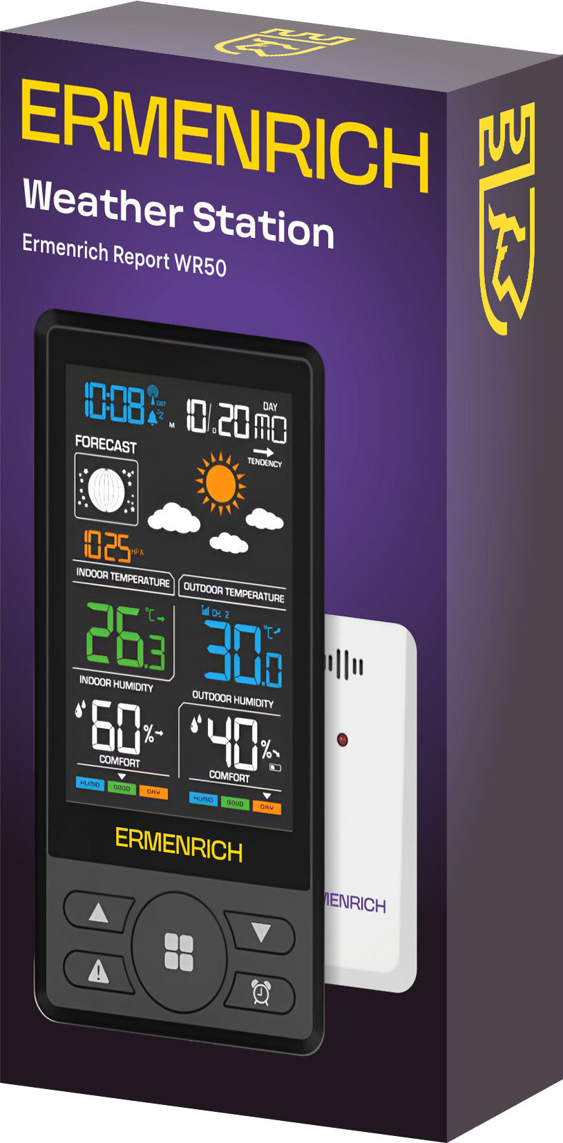 La stazione meteorologica domestica Ermenrich Report WR50 dispone di un’ampia gamma di funzionalità, che sono preziose nella vita di tutti i giorni. Aiuta a monitorare i cambiamenti meteorologici esterni e a controllare il microclima interno. Il grande schermo a colori visualizza tutte le informazioni importanti sull’atmosfera: temperatura e umidità interna ed esterna, pressione atmosferica, previsione meteorologica e livello di comfort. Il dispositivo può anche funzionare come orologio e calendario digitali, con la parte inferiore dello schermo dedicata a queste informazioni. Se posizionato su un comodino, può anche servire da sveglia. Coloro che si interessano di astronomia o di segni popolari saranno lieti di vedere un altro utile parametro visualizzato sullo schermo: le fasi lunari.