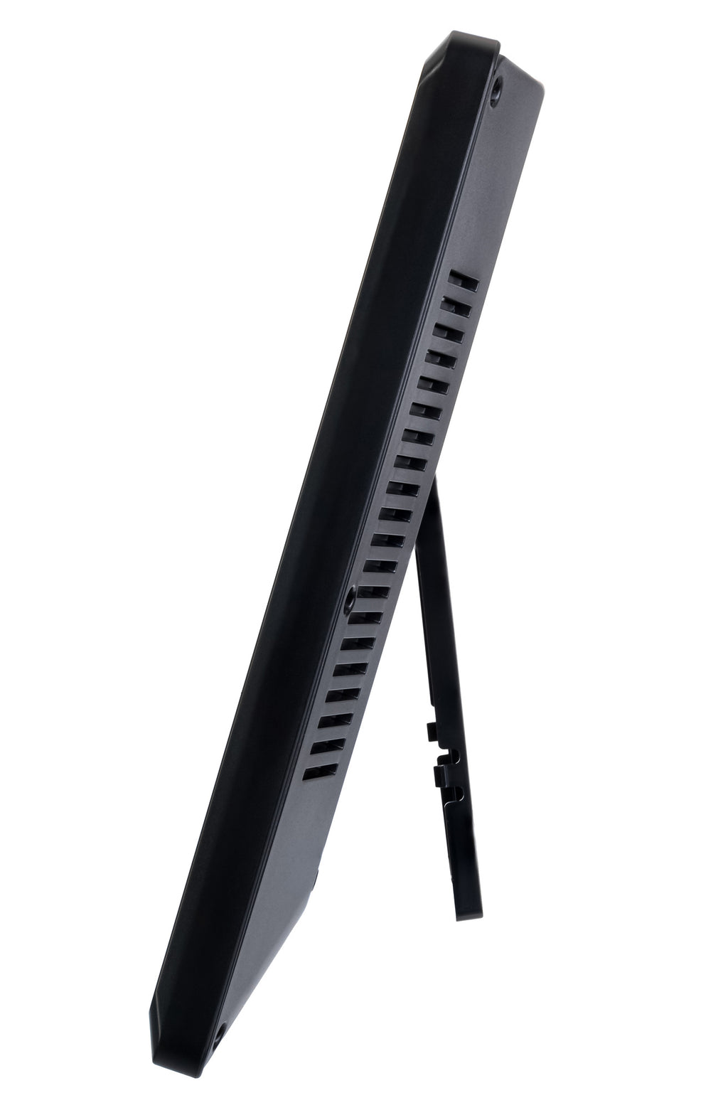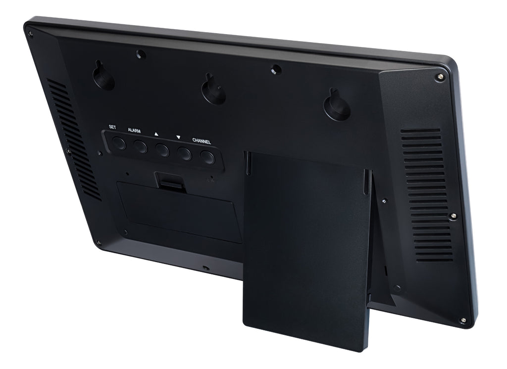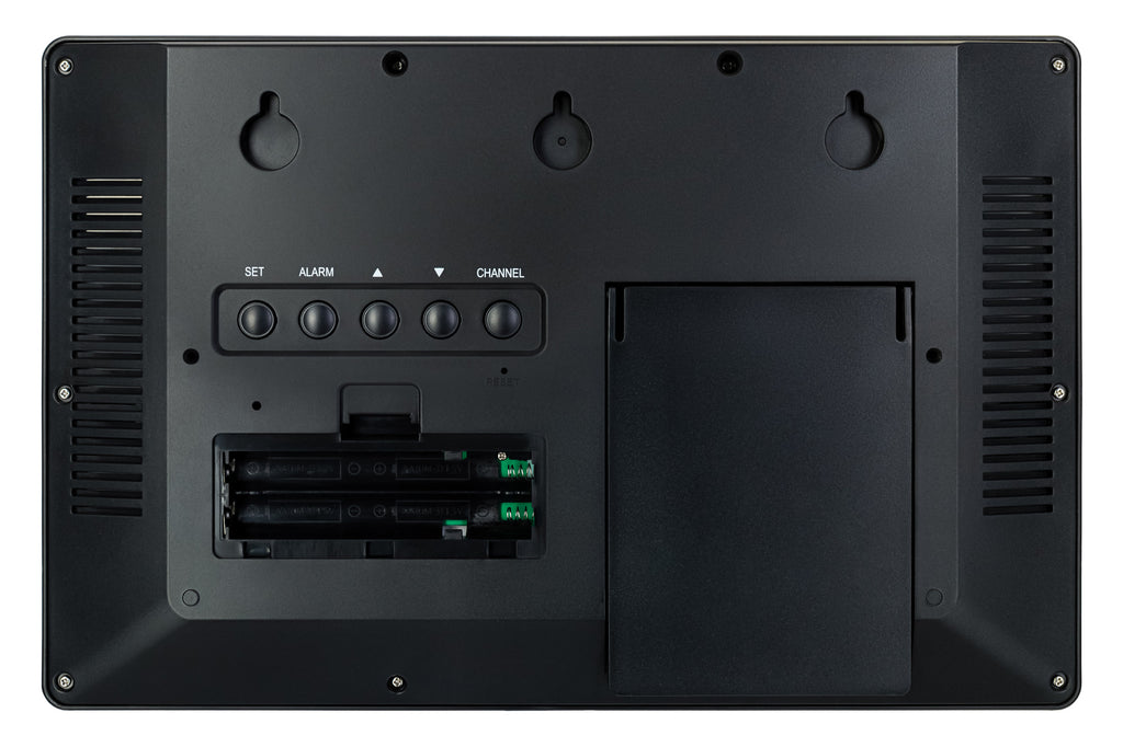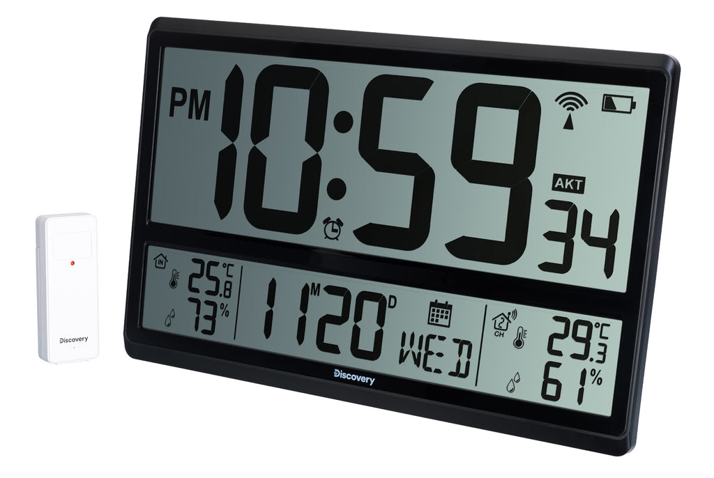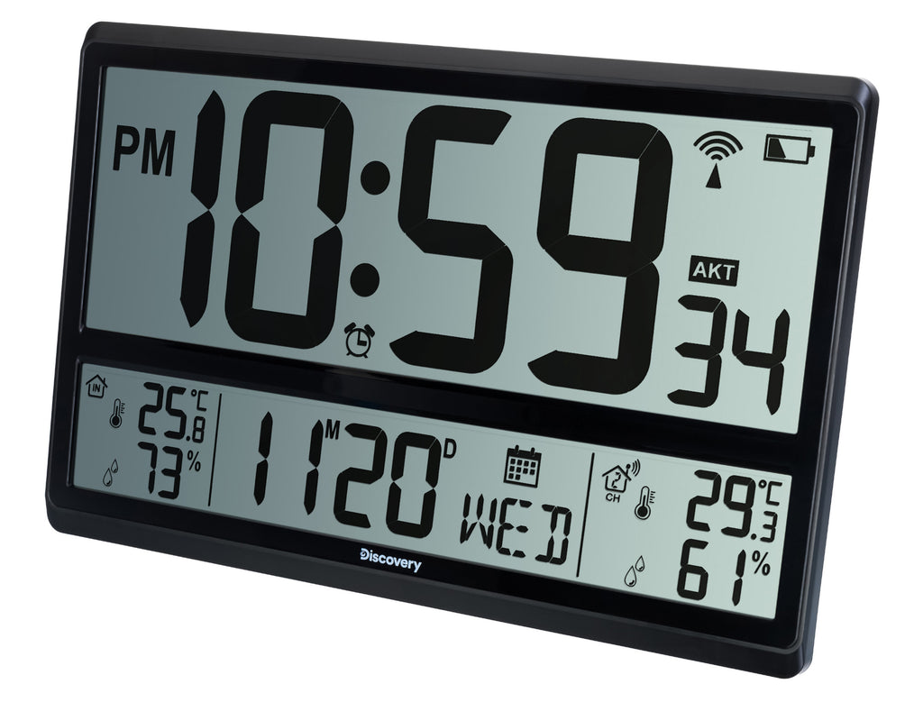 Il pannello frontale contiene una coppia di schermi monocromatici. Lo schermo superiore è più grande ed è occupato dall’orologio. L’ora è scritta in grande e chiaramente, tanto che le cifre sono leggibili facilmente anche da lontano. Lo schermo inferiore è più piccolo. La parte centrale è occupata dal calendario, a sinistra e a destra sono mostrate le misure del termometro e dell’igrometro, all’aperto e al chiuso. I pulsanti di controllo sono posizionati sul rivestimento posteriore.