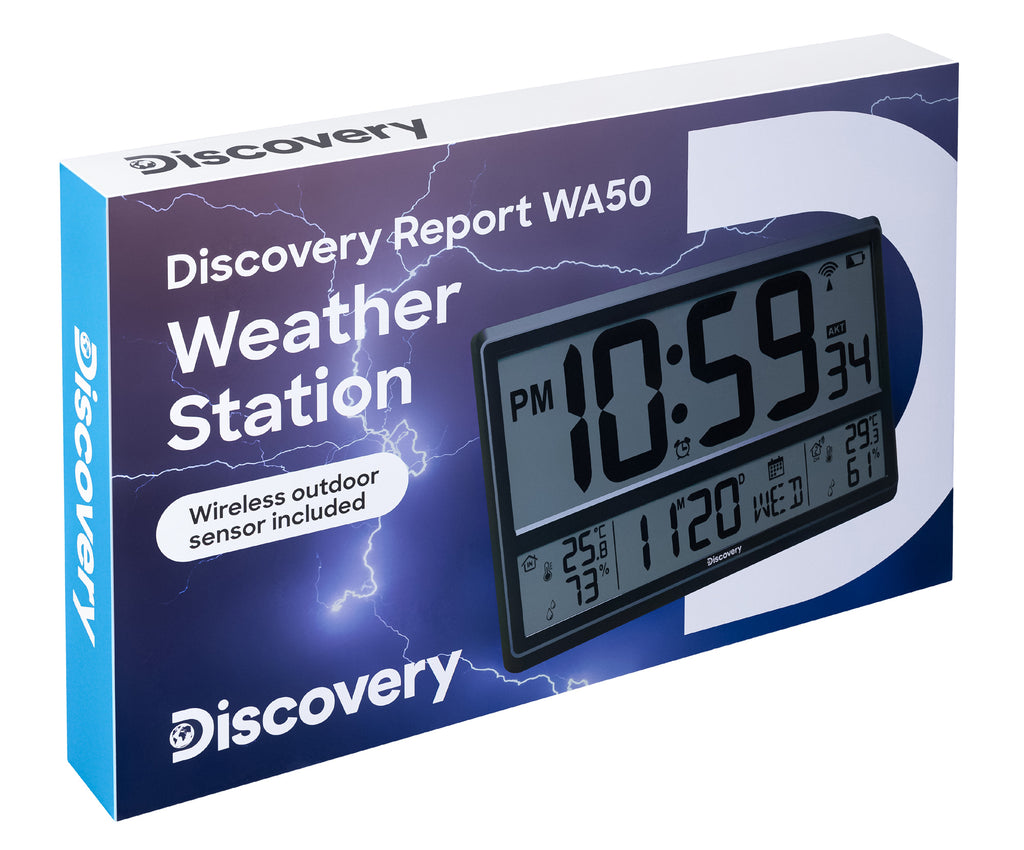 Levenhuk Discovery Report WA50 è un gadget accattivante e ricco di stile, perfetto come regalo. Grazie al corpo affusolato, il design risulta leggero e raffinato, mentre le funzionalità restano al pari dei modelli analoghi. Questa stazione meteorologica misura la temperatura e il livello di umidità, mostra l’ora, la data e il giorno della settimana. Inoltre, è dotata di sveglia. Un termoigrometro remoto (sensore) è incluso.