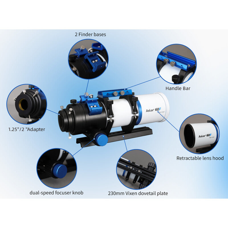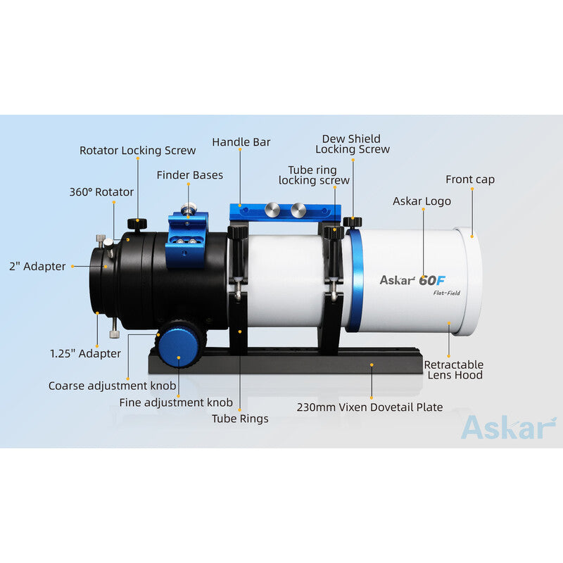 Che tu stia pianificando un'uscita sotto cieli scuri o cercando uno strumento di alta qualità per il tuo setup leggero, l'Askar 60F è la soluzione perfetta per immagini a largo campo mozzafiato, senza complicazioni.