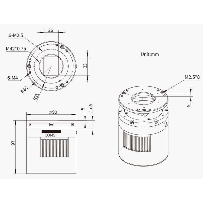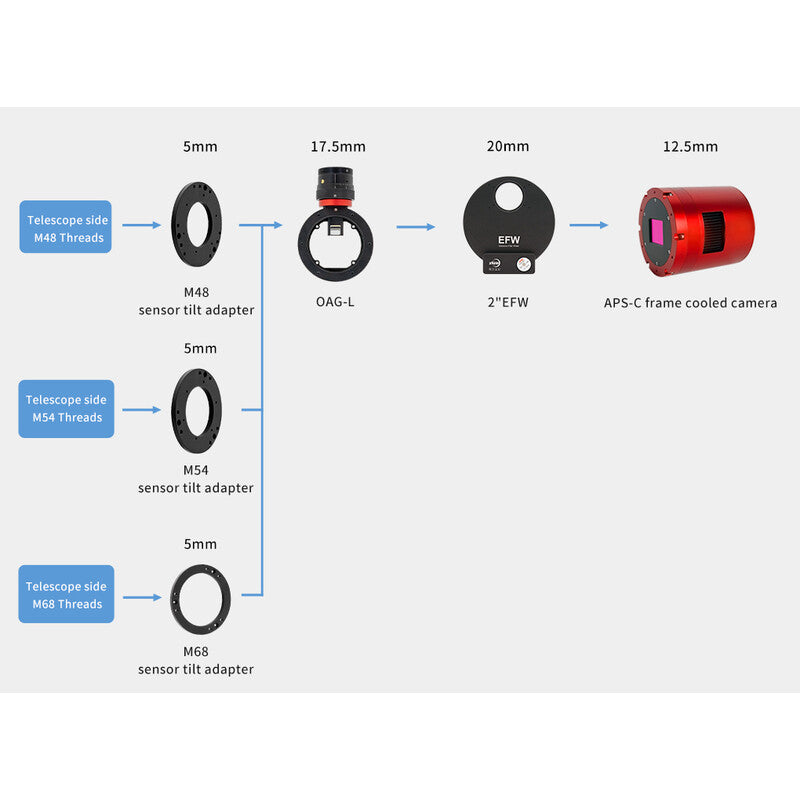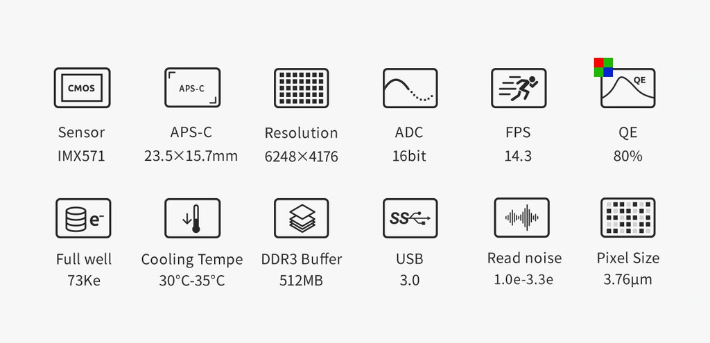 Sensore APS-C Sony IMX571: Il cuore della camera è un sensore CMOS retroilluminato (BSI) in formato APS-C (23.5 mm x 15.7 mm). Questo formato offre un campo visivo ampio, ideale per nebulose estese e grandi ammassi, senza i requisiti di correzione ottica estremi richiesti dai sensori Full Frame.