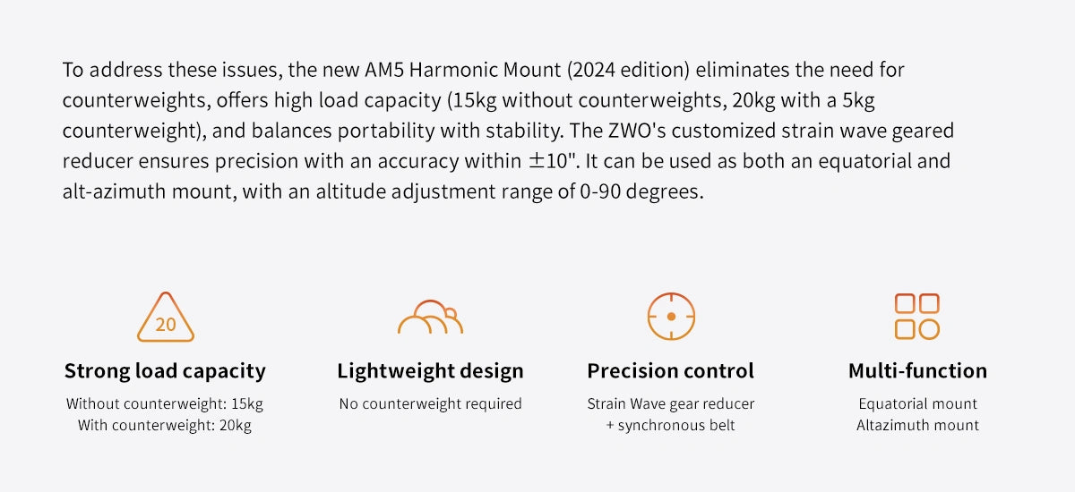 ZWO propone la montatura equatoriale armonica AM5, una montatura trasportabile per l'astrofotografia. La montatura pesa meno di 5 kg e regge telescopi fino a 13 kg senza contrappeso. Con il contrappeso e l'asta del contrappeso (non inclusi), la montatura può reggere telescopi fino a 20 kg. Questa montatura entusiasmante è stata sviluppata in diversi anni di lavoro e ha ottenuto vari brevetti.